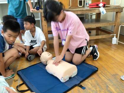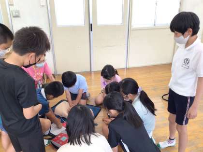 AEDは代表の子が実習する様子を見て使い方を学びました。