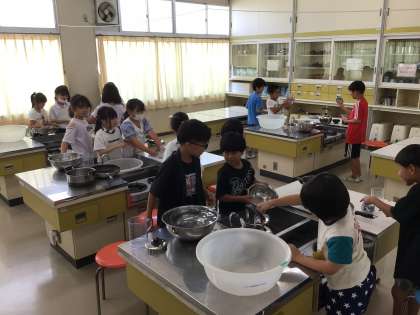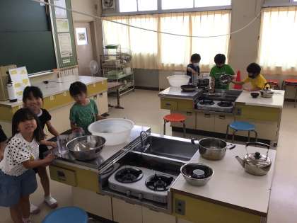 算数の「かさ」の学習で、身近にあるものはどれくらいの水が入るのか試しました。