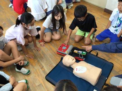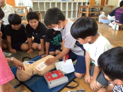 倒れている人を見かけたときの対応を学び、AED使用の体験をしました。