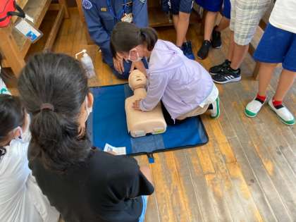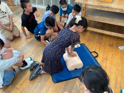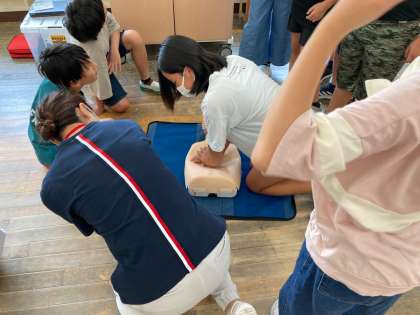 応急手当講習で、胸骨圧迫やAEDについて体験しながら学びました。