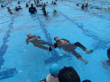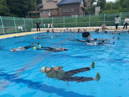 無事に行うことができました。体育館で講義を聞いた後、実際にプールで講習を受けました。ペットボトルを使って上手にぷかぷかと浮いていました。準備をしてくださり、ありがとうございました。