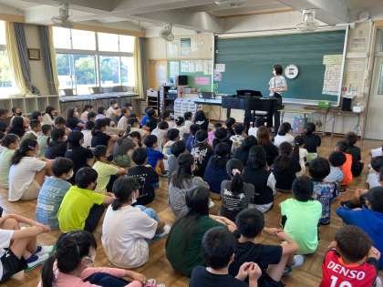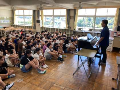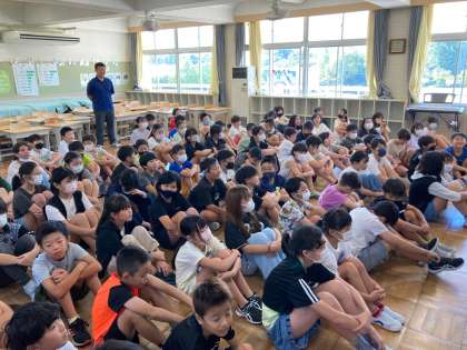 学年集会で、先生たちの夏休みの思い出を聞きました。 また、今後の活動や行事について確認しました。