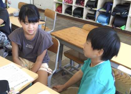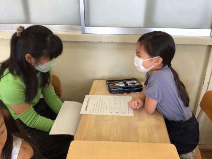 夏休みの思い出についてクイズを作り、ペアで話して楽しみました。