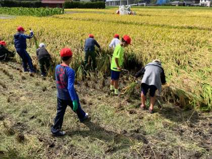 5年さわやか 稲刈り 公開日 2023/09/19 更新日 2023/09/19 各学年から いよいよ稲刈りです。 5月に田植え(手植え)したものを刈りました。暑い中の作業だったので、当初よりも短く15分で作業を終えました。 初めは刈り方がわからず、悪戦苦闘していましたが、だんだんコツを掴んで上手に刈ることができるようになってきました。初めから上手な子もいて、スムーズに作業が進みました。 Nファミにも1名ボランティアとして参加していただきました。ありがとうございました。