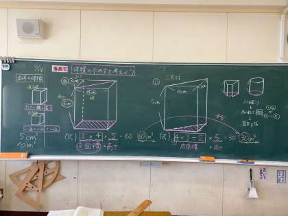 6年 算数 立体の体積1 公開日 2023/09/19 更新日 2023/09/19 各学年から 新しい単元に入り、習熟度別学習に戻りました。5年生のときに学習した直方体や立方体の体積の求め方から、底面積×高さという式を導き出しました。