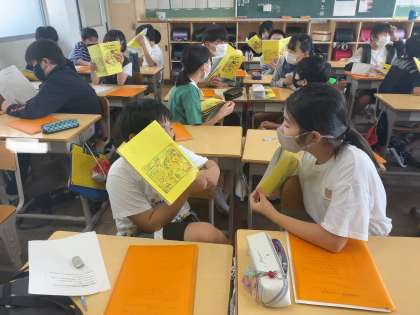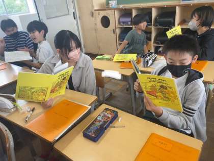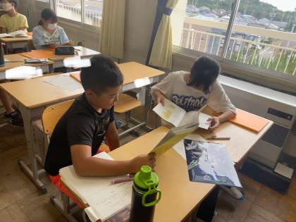 しおりが完成しました。時刻や場所についてのクイズを出し合いながら、2日間の活動予定を覚えていきます。