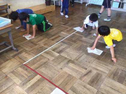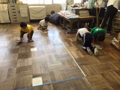 高学年が隅々まで丁寧に床の掃き掃除をしたり