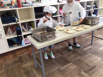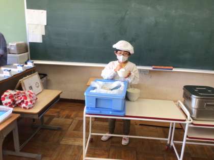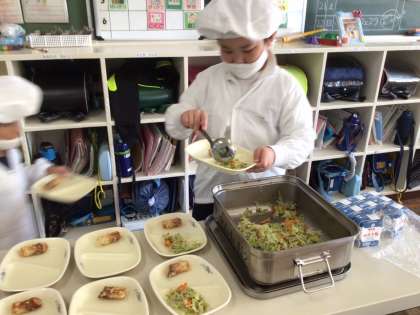 1年生もメンバーに加わり、クラスみんなで配膳に取り組んでいます。