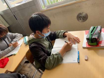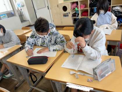 6年 国語 ことばのきまり2 公開日 2023/10/25 更新日 2023/10/25 各学年から 欠席児童が多かったので、授業は進めずに、ことばのきまりを使って1年生からの復習をしました。おね(い・え)さん、お(う・お)さま、と伸ばす音を答える問題や、熱い↔︎( )、貸す↔︎( )と反対の言葉を答える問題など、改まって聞かれると迷っている様子でした。