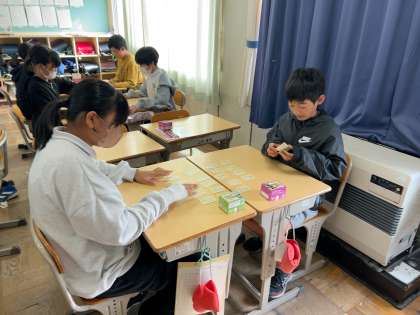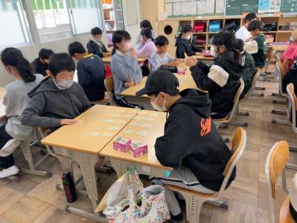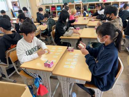 6年 国語 百人一首 公開日 2023/11/16 更新日 2023/11/16 各学年から 冬休み明けに、今年度もNカル大会(百人一首大会)が開かれます。今日の全校集会で今年の札が黄色札に決まり、さっそく練習をしました。