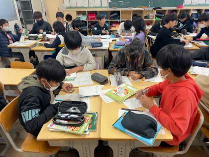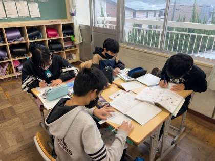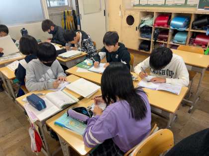 応用コースでは、自由進度学習を進めています。はじめに各々が1時間のめあてを考え、個人で学習を進めていきます。その後、くじで決めたグループなり、互いの進捗状況を確認しながらグループ学習を進めます。最後に振り返りをして、次の時間の計画を立てます。振り返りからそれぞれの学習進度や理解度が分かるので、その都度声をかけていきます。