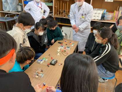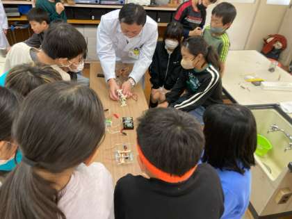 5年 デンソーサイエンススクール 公開日 2023/11/29 更新日 2023/11/29 各学年から デンソーサイエンススクールとして、デンソーから4名の講師をお招きして、実験や考察を繰り返しながら、電磁石の性質について学びました。 お土産として「くぎ、エナメル線」のセットをいただきました。お家でも、電池に繋ぐと簡単に電磁石を作ることができます。ぜひ、体験してみてください。導線をつなぐと、熱くなりますので、ご注意ください。