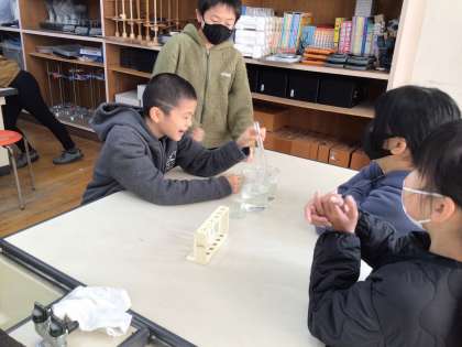 試験管に石鹸水の膜を張り、空気の温度の変化によって、体積がどう変わるか実験しました。