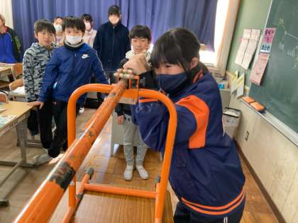 支点、力点、作用点。力点や作用点の位置を変えると、加える力に変わりがあるかを調べました。