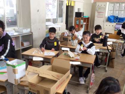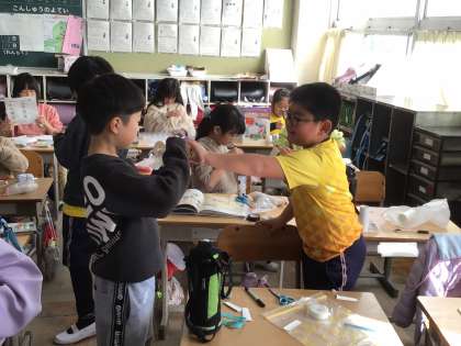 生活科でオリジナルのおもちゃを作りました。工夫をこらした作品がたくさんあります。