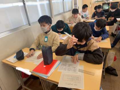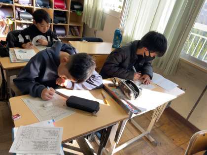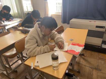 卒業式の合唱のパート練習をする関係で、パートごとでの授業の時間があります。国語では、卒業文集の下書きを進めています。