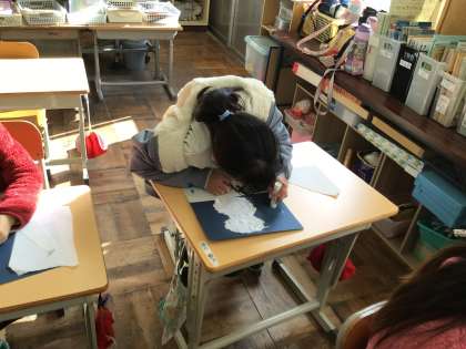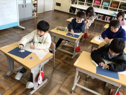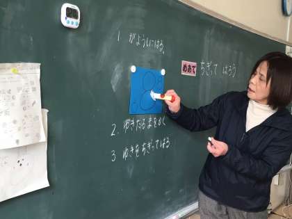 7・8・9・10組 2月のカレンダーは?ー生活単元ー 公開日 2024/01/26 更新日 2024/01/26 各学年から 8組の生活単元の学習で取り組んでいるカレンダー作り。 今月の活動のめあては、“ちぎってはる“です。 2月のカレンダーの絵、雪だるまのふわふわした感じを表現するために 和紙を思い思いにちぎって、下絵に貼っていきました。 先日雪が降ったこともあり 和紙のふわふわした感触を雪に見立てながら マイ雪だるまのちぎり絵を、楽しみながら制作することができました。