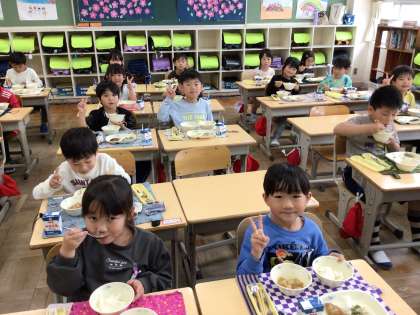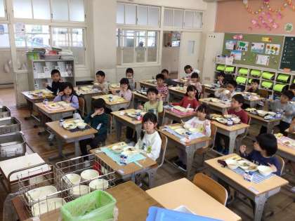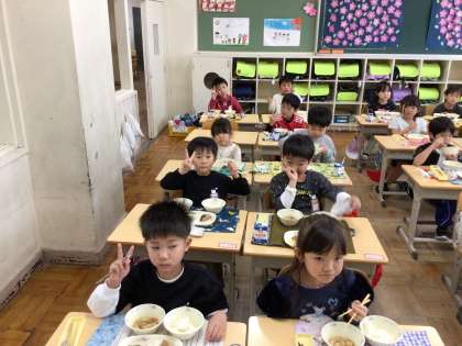 今日から給食が始まりました。当番の子を中心に準備をして、みんなでおいしくいただきました。