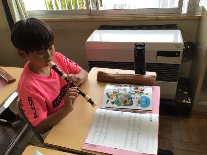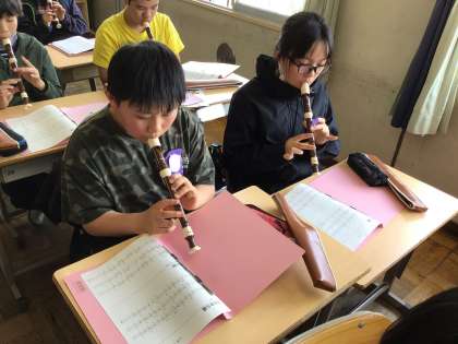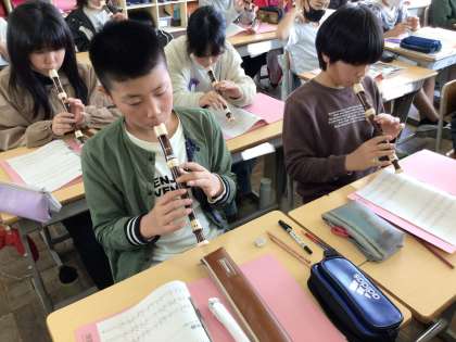 初めての音楽の授業では、リコーダーの練習と、「つばさをください」を歌いました。
