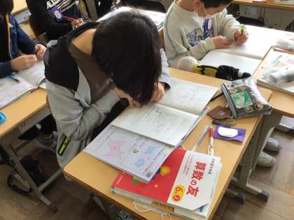 6年 算数 対称な図形1 公開日 2024/04/12 更新日 2024/04/12 各学年から 応用クラスでは、昨日学習した線対称な図形の描き方をもとに、点対称な図形の描き方を考えました。教科書の問題に取り組んだら、定着できるようにスキルや算数の友の問題に取り組みます。
