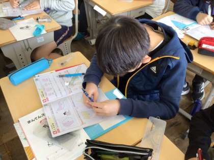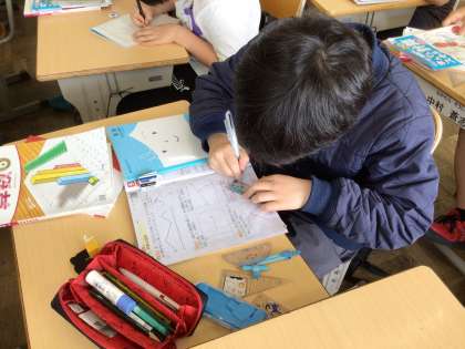 応用クラスでは、昨日学習した線対称な図形の描き方をもとに、点対称な図形の描き方を考えました。教科書の問題に取り組んだら、定着できるようにスキルや算数の友の問題に取り組みます。