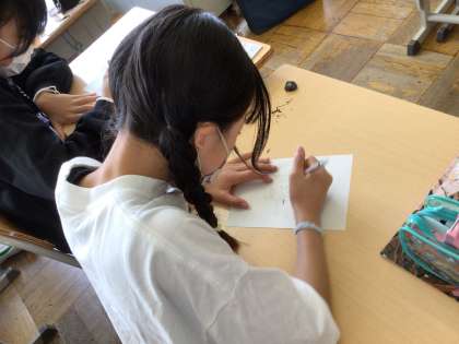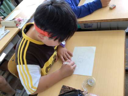 グループでお絵かきリレーをしながら、それぞれが描いた絵のよさについて話し合いました。