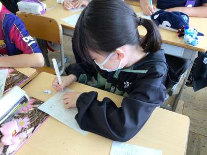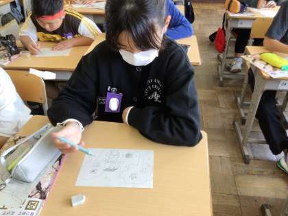 グループでお絵かきリレーをしながら、それぞれが描いた絵のよさについて話し合いました。