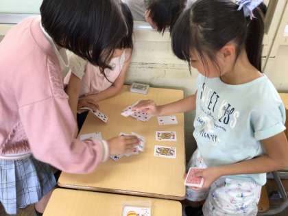友だちとトランプやカードゲームをやりながら、休み時間を過ごしています。