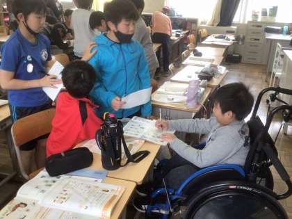 7・8・9組 授業参観頑張ったよ!(その1) 公開日 2024/04/23 更新日 2024/04/23 各学年から 4月20日に今年度初めての授業参観が行われました。 子ども達は、お父さんやお母さんに 頑張っている姿を見てもらいたいと 張り切って授業に臨んでいました。 5年生は、全員1時間目が交流の授業でした。 それぞれの交流学級で、 社会や図工、英語の学習に真剣に取り組んでいました。 また、グループ活動など友達と関わる活動にも進んで取り組んでいました。