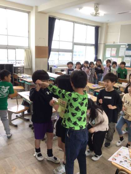 音楽の授業では、手拍子しながら「子犬のビンゴ」を元気よく歌ったり、「ロンドンばしおちた」を楽しんだりしました。