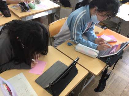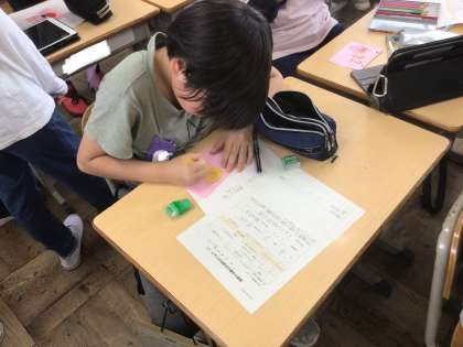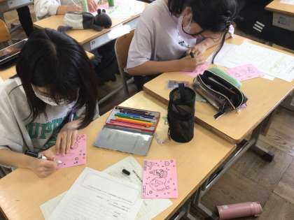 第一回の縦割り遊びに向けて、一年生が喜んでくれる名札作りをしています。