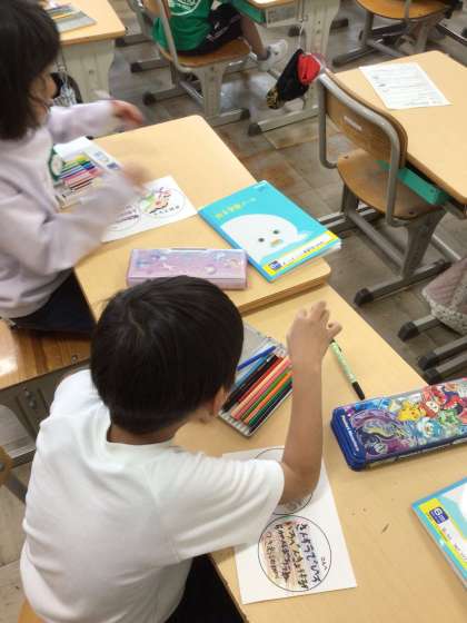 生活科の授業で、「1年生に学校を案内しよう」の準備を進めています。特別教室の紹介クイズを考えたり、プレゼントを制作したりしています。