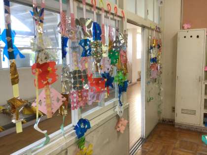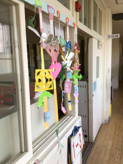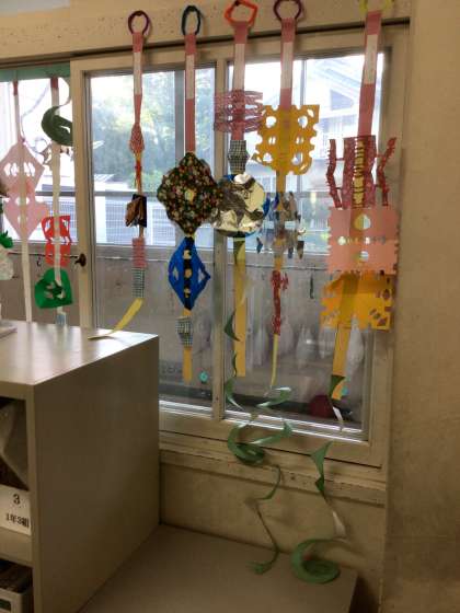折り紙やさまざまな材料をハサミで切って飾りを作りました。
