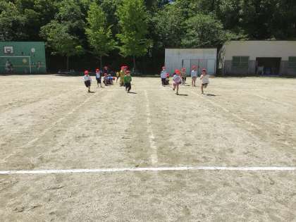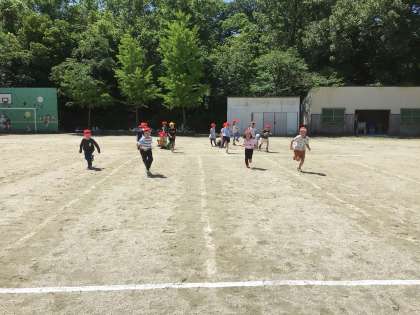 体力テストの50m走に向けて、真っ直ぐ走る練習をしました。