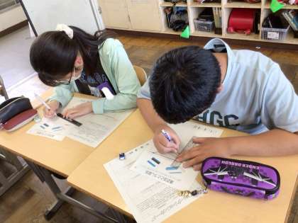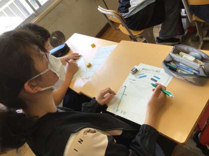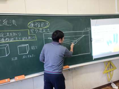 6年間通った校舎をモチーフに思い出の風景を描きます。今日は、透視図法について学習しました。