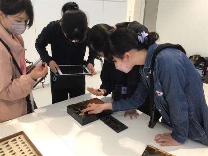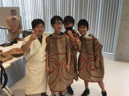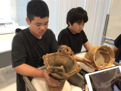 博物館では実際の土器や道具、服などを触ってみたり、展示物から気づいたことをタブレットにまとめたりしました。