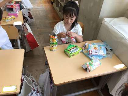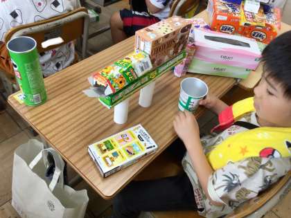 「いろいろなかたち」の学習で、持ってきた箱を組み合わせて、乗り物や動物、建物などを作りました。
