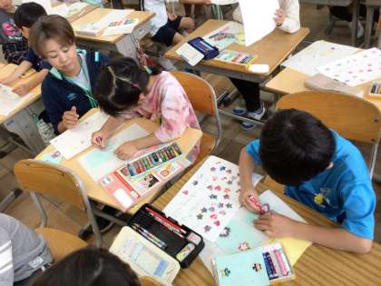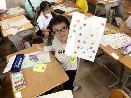 1年生の目標を考えてかきました。クレヨンステンシルで周りに飾り付けをしました。