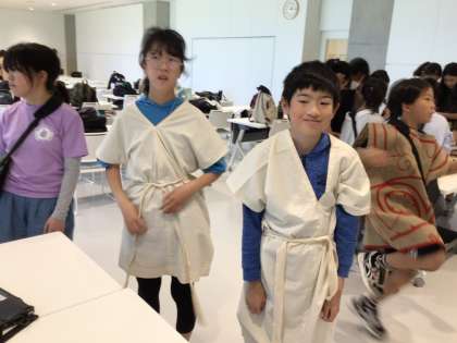 写真は、縄文人、弥生人の衣装を着る体験をしたときのものです。