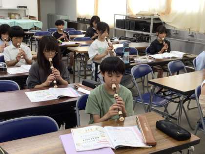 グループごとに、2つのパートに分かれてリコーダーの練習をしています。