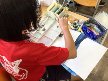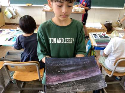 読書感想画に向けて、練習をはじめました。 持ってきた歯ブラシを使って、素敵な星空や天の川を表現しました。