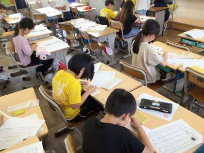 講師の方に来ていただき点字について教えていただきました。 自分の名前や、学年、組などを点字で書きました。