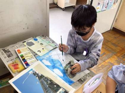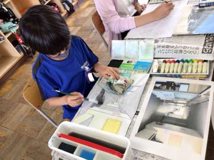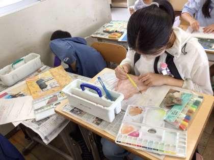 下書きが進み、絵付けに入りました。絵の具の水分量に気をつけながら色をのせていきます。