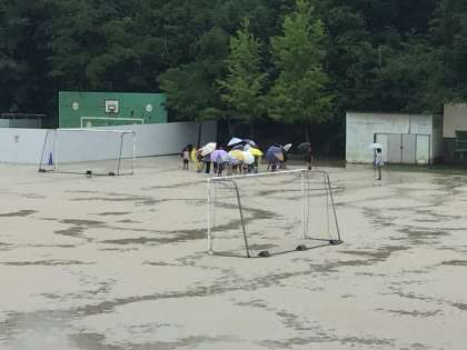 6月28日(金)、雨の日に校庭で生活科の授業をしました。運動場に流れる雨水やくもの巣についた水滴を見たり、雨の日の南山は危険が潜んでいることを発見しました。