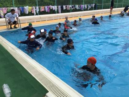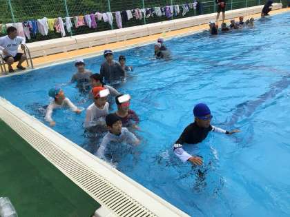 6年 着衣泳講習会2 公開日 2024/07/18 更新日 2024/07/18 各学年から 消防署の講師の方をお招きして、着衣泳講習会を行いました。川や海で流されてしまったときは、慌てず浮いて待つことで助かる可能性が上がることを学びました。また、実際に服を着たままプールに入ることで、思うように体を動かすことができないことを実感しました。
