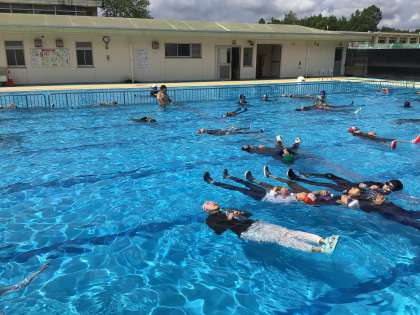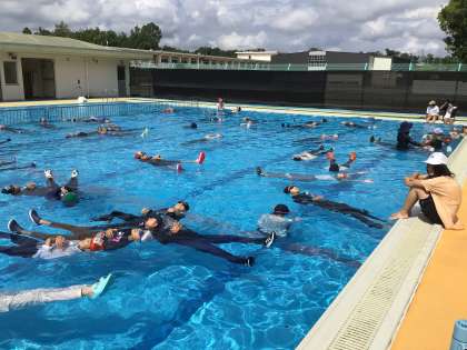消防署の講師の方をお招きして、着衣泳講習会を行いました。川や海で流されてしまったときは、慌てず浮いて待つことで助かる可能性が上がることを学びました。また、実際に服を着たままプールに入ることで、思うように体を動かすことができないことを実感しました。