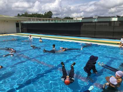 消防署の講師の方をお招きして、着衣泳講習会を行いました。川や海で流されてしまったときは、慌てず浮いて待つことで助かる可能性が上がることを学びました。また、実際に服を着たままプールに入ることで、思うように体を動かすことができないことを実感しました。