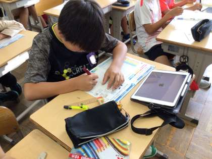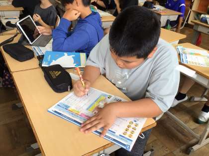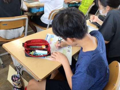 学校に届いたはがきに暑中見舞いを書きました。