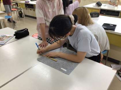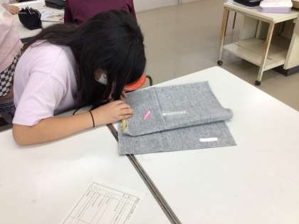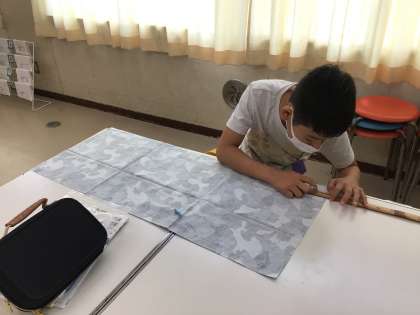 ナップザックづくりが始まりました。まずは、チャコペンシルで印をつけました。