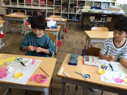 手でちぎった紙テープを花びらに見立てて、細く伸びた茎は色鉛筆で描きました。